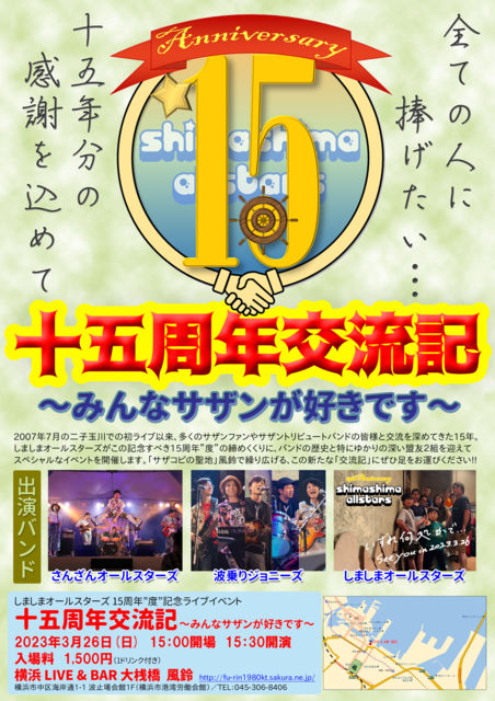 2007ǯ7·î¤ÎÆó»Ò¶ÌÀî¤Ç¤Î½é¥é¥¤¥Ö°ÊÍ衢¿¤¯¤Î¥µ¥¶¥ó¥Õ¥¡¥ó¤ä¥µ¥¶¥ó¥È¥ê¥Ó¥å¡¼¥È¥Ð¥ó¥É¤Î³§Íͤȸòή¤ò¿¼¤á¤Æ¤¤¿15ǯ¡£ ¤·¤Þ¤·¤Þ¥ª¡¼¥ë¥¹¥¿¡¼¥º¤¬¤³¤ÎµÇ°¤¹¤Ù¤15¼þǯ"ÅÙ"¤ÎÄù¤á¤¯¤¯¤ê¤Ë¡¢¥Ð¥ó¥É¤ÎÎò»Ë¤ÈÆÃ¤Ë¤æ¤«¤ê¤Î¿¼¤¤ÌÁͧ£²ÁȤò·Þ¤¨¤Æ¥¹¥Ú¥·¥ã¥ë¤Ê¥¤¥Ù¥ó¥È¤ò³«ºÅ¤·¤Þ¤¹¡£ ¡Ö¥µ¥¶¥³¥Ô¤ÎÀ»ÃÏ¡×É÷Îë¤Ç·«¤ê¹¤²¤ë¡¢¤³¤Î¿·¤¿¤Ê¡Ö¸òήµ¡×¤Ë¤¼¤Ò¤ò¤ª±¿¤Ó¤¯¤À¤µ¤¤!! ¡ü¥é¥¤¥Ö¥¿¥¤¥È¥ë ¤·¤Þ¤·¤Þ¥ª¡¼¥ë¥¹¥¿¡¼¥º 15¼þǯ"ÅÙ"µÇ°¥é¥¤¥Ö ¡Ö½½¸Þ¼þǯ¸òήµ¡Á¤ß¤ó¤Ê¥µ¥¶¥ó¤¬¹¥¤¤Ç¤¹¡Á¡× ¡üÆü»þ 2023/3/26(Æü)¡¡15:00³«¾ì¡¿15:30³«±é ¡ü¾ì½ê L