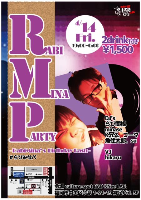 RABI MINA PARTY -RabiMina's Birthday Bash- 4/14(¶â) 19:00-24:00 \1,500(2¥É¥ê¥ó¥¯ÉÕ) #badkneelab Ê¡²¬»ÔÃæ±û¶èº£Àô1-21-19ÍçÂ¥Ó¥ë 3F badknee.bitfan.id ¡ÚDJ¡Û¤é¤Ó´Øº¬¡¢minase¡¢K.n.Z¡¢¥³¡¼¥¿¡¢µû½»ÂÀϺ¡¢su ¡ÚVJ¡Ûhikaru ¡ô¤é¤Ó¤ß¤Ê¥Ñ