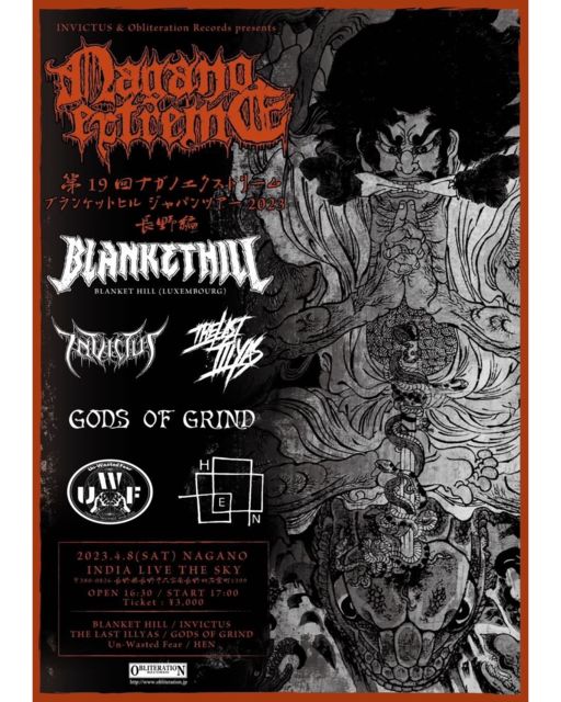 NAGANO EXTREME 19 BLANKET HILL JAPAN TOUR 2023 in NAGANO BLANKET HILL (Luxembourg) Gods of Grind hen The last Illyas Un-Wasted Fear INVICTUS OPEN:16:30 START:17:00