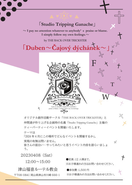 オリジナル創作活動サークル「THE BACK OVER TRICKSTER」と仲間達が作り上げる企画時の名義「Studio Tripping Ganache」主催のティーパーティーイベントを開催いたします。
