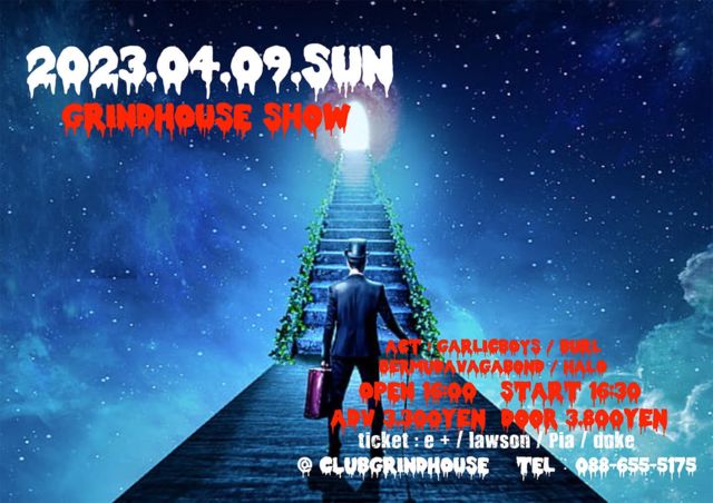 2023/04/09(日) 徳島CLUB GRINDHOUSE "GRINDHOUSE Show" OPEN 16:00 START 16:30 ADV \3,300 DOOR \3,800 (+1D \600) GARLICBOYS バミューダ★バガボンド BURL HALO チケット予約 ◆バンド取り置き ・バ★バ各メンバー ・bermudavagabond@gmail.com ◆プレイガイド ・ローチケ 63749 ・チケットぴあ 237-647 ・d-ticket ・e+
