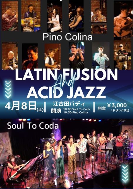 Soul To Coda 3年半ぶりのライブです! セトリは王道Incognito&Acid Jazz13曲 強力サポートメンバー3名をお迎えして 総勢13名で華やかにお届けします 対バンのPino Colinaさんも素敵&大所帯 ラテンフュージョンをガッツリ聴かせてくださいます ぜひぜひ遊びにいらしてくださいね💕 <<Acid Jazz & Latin Fusion Live>> 日程:2023年4月8日(土) 場所:江古田Buddy 時間:開場17時30分 Soul To Coda 18時〜 Pino Colina 19時30分〜 料金:3,000円/小学生以下1,000円(いずれも1ドリンク代込)