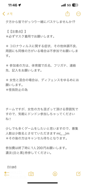 20代〜30代中心の和気あいあいとしたバスケサークルです! 初心者〜中級で楽しくやってます! 初心者は1〜2割程度。ボールはあればでOKです。 一人参加・ブランク歓迎! 外国人の方もいます 会費は基本1000円、1500円コートもあり。 ※男性から女性へのカットはファールとしています。 申込みは ・漢字フルネーム ・Eメールアドレス ・年齢 ・お住まいの区 ・勤務先の区 ・参加希望日時 を記載のうえ、必ずメッセージをお願いします。 ご連絡お待ちしております〜!