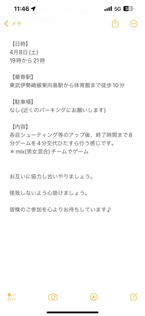 ■日時:4/8(土)14:00〜16:00 ■場所:目白台運動公園 屋外コート(タイル張り) ■チーム名:不明 雨天の場合は、12時頃に中止連絡頂けるとのこと。