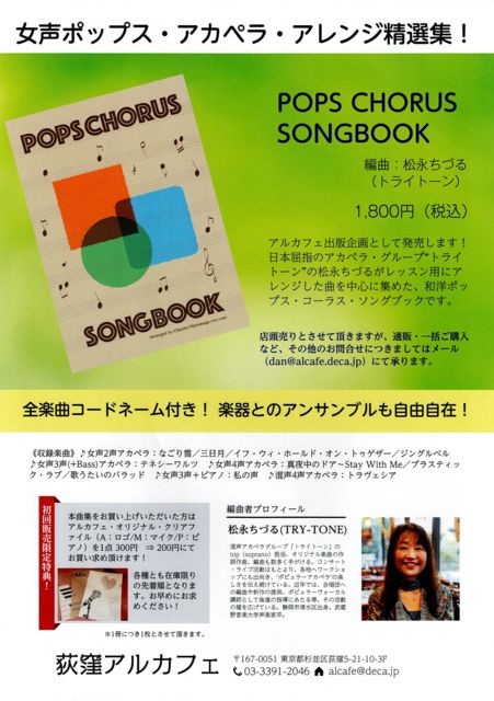 松永ちづるの女声ポップス・アカペラ・アレンジ精選集 「POPS CHORUS SONGBOOK」を2月6日よりアルカフェ出版企画として発売しました! 楽譜も欲しいしまずは歌ってみたい!といふコーラス・ファンに朗報です。 「POPS CHORUS SONGBOOK」即売会&お試し会を開催します! 合唱団で検討したい方もまずは1冊からご購入ください!全10曲を毎回歌っていきます。 全10回開催予定。松永ちづるのコーラス・ワールド(略して松コー)を体験してみませんか。レッツ・松コー! 【時間】13:30〜15:30(営業時間は13:00〜17:00/L.O.16:30)※開始時間にご注意く