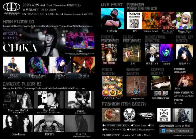 Àº±Ô¤ÎDJ¿Ø¤Ë¤è¤êˤ®½Ð¤µ¤ì¤ë²»¤Î¿ô¡¹¡£ ¿¼¤¯¡¢½Å¤¯¡¢¤½¤·¤Æ·ã¤·¤¯¶Á¤ÅϤ륵¥¦¥ó¥É¤Ï³§Íͤο´¤È¿ÈÂΤòÊá¤é¤¨¤ÆÍɤµ¤Ö¤ê³¤±¤ë¤Ç¤·¤ç¤¦¡£ ¤½¤·¤Æ¡¢ ²ø¤·¤¯ßê¤á¤¯Shop Booth¡¢ ´Ñ¤ë¼Ô¤ò¶Ãò¤µ¤»¤ëPerformance¡¢ ¤½¤·¤Æ²ñ¾ì¤ò²Ú¡¹¤·¤¯¾þ¤ëFashion¡¢ ¤³¤³¤ËÀ¸¤Þ¤ì¤ë¤Î¤Ï¥¸¥ã¥ó¥ë¤ò±Û¤¨¤¿¿·¤¿¤Ê¤ë¶õ´Ö¡£ ¡ÚDark Dimension¡Ý°Å¹õŪ¼¡¸µ¡¼¡Û ¡Á5ǯ¿¶¤ê¤Î³«¹õ¡Á ¢÷DATE¢÷ 2023.4.29(sat) ¢÷OPEN-CLOSE¢÷ 23:30-5:00 ¢÷PLACE¢÷ ¿·½ÉLOFT ÅìµþÅÔ¿·½É¶è²ÎÉñ´ìÄ®1-12-9 ¥¿¥Æ¥Ï¥Ê¥Ó¥ëB2 TEL:03-5272-0382 ¢÷ENTRANCE FEE¢÷ Do