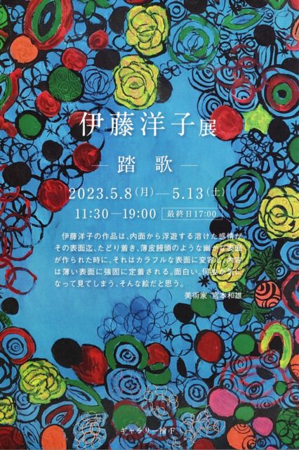 ・「ゴールデンウィーク開けて早々の一週間」と覚えといてくだされば。 ・会期中、作家本人による自作詩の朗読があります。 05/08 月 (初日) 及び 05/12 金 (いずれも 18:00 - ) 「伊藤 洋子 の作品は、内面から浮遊する溶けた感情が、その表面迄、たどり着き、薄皮饅頭のような幽かな表面が作られた時に、それはカラフルな表面に変容し、内容は薄い表面に強固に定着される。面白い。何故か気になって見てしまう、そんな絵だと思う。」 美術家 宮本 和雄 [展示] 2023/05/08 Mon - 2023/05/13 Sat 11:00 - 19:00 (最終日 : - 17:00)