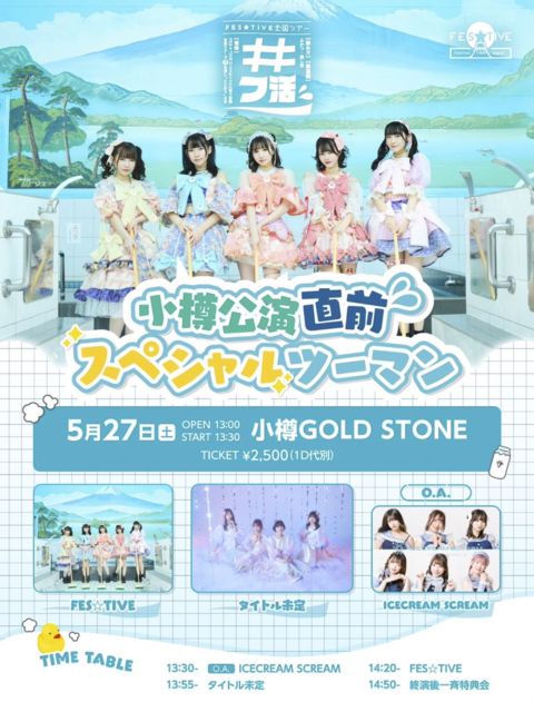 【北海道】「FES☆TIVE全国ツアー #フ活 小樽公演直前スペシャルツーマン」 日程:05/27(土) 開場13:00 / 開演13:30 会場:小樽ゴールドストーン http://www.goldstone.co.jp/access.html 〒047-0031 小樽市色内3-3-21 旧澁澤倉庫 料金:2,500円 (D別) チケット:https://tiget.net/events/247679 ※5/15(月)21:00〜販売開始 GUEST:タイトル未定 O.A:ICECREAM SCREAM