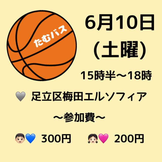 参加費:100円 みんなで楽しくバスケできる方を募集します。 場所の詳細は個別に連絡させていただきます。 よろしくお願いします!