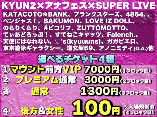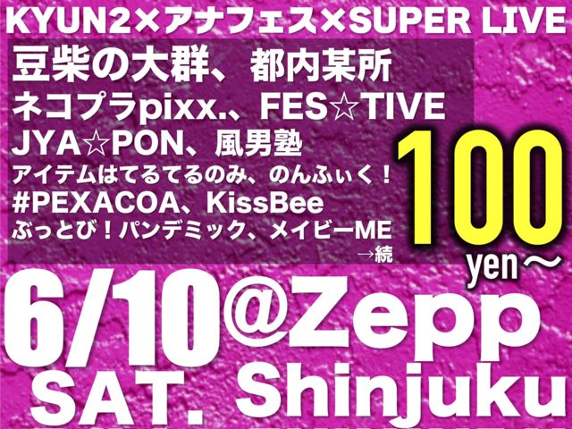 「KYUN2 ×アナフェス× SUPER LIVE」 日程:06/10(土) 開場10:00 / 開演10:20 会場:Zepp Shinjuku 料金:VIP 7,000円 / プレミアム 3,000円 / 通常 1,300円 / 後方&女性 100円 ※再入場FREE チケット:https://t.livepocket.jp/e/0610_zeppshinjuku ※5/24(水)20:00〜