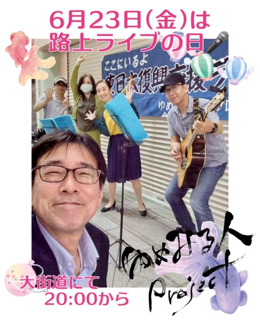 金曜日は路上ライブ! 沖縄・奄美地方の雨が心配ですね。 恵の雨に変わるように 大街道から心を込めて歌います。 ■第271回 東日本復興応援ライブ 6月23日(金) 20:00〜22:00 ※状況により終了時間の変更、もしくは中止の可能性があります。ご了承ください。 松山市大街道内 スペース田中前にて 募金や被災地へのメッセージを集め 東日本を応援するための路上ライブです。 この活動は2011年3月18日より始まり 活動を行うにあたり松山東警察署および株式会社まちづくり松山への許可を頂いております。 ☆お知らせ☆ 私た
