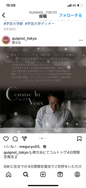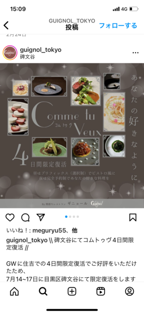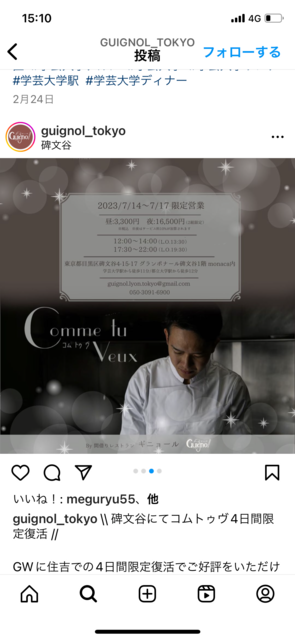 今回は名古屋で人気だった間借りフレンチのお店が4日間限定で都内に間借りでオープンしたので企画しました。 名古屋時代の食べログ https://s.tabelog.com/aichi/A2301/A230101/23079936/ 日時 7月16日 お店 コムトゥブ 開催場所 間借りレストラン Guignol(開催場所) https://s.tabelog.com/tokyo/A1317/A131702/13281408/ 時間 12時〜14時くらい 会費3300円+ドリンク代 今回はプリフィクススタイルでの提供になります。 キャンセルについて キャンセルは前日までに連絡下さい。 それ以降のキャン