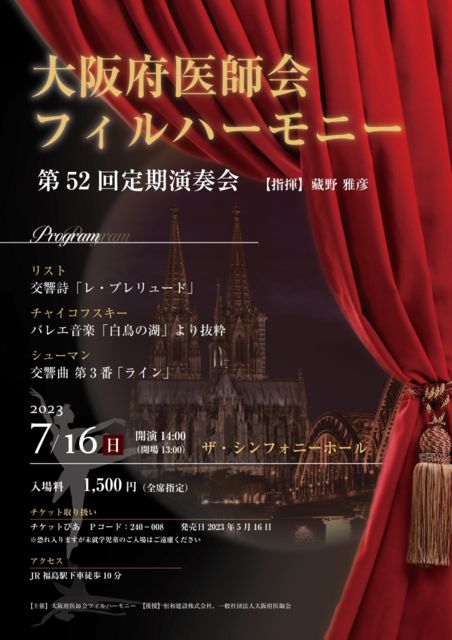 指揮:藏野雅彦 管弦楽:大阪府医師会フィルハーモニー 曲目: リスト/交響詩「前奏曲」 チャイコフスキー/バレエ音楽「白鳥の湖」より抜粋 シューマン/交響曲 第3番 変ホ長調 op.97「ライン」