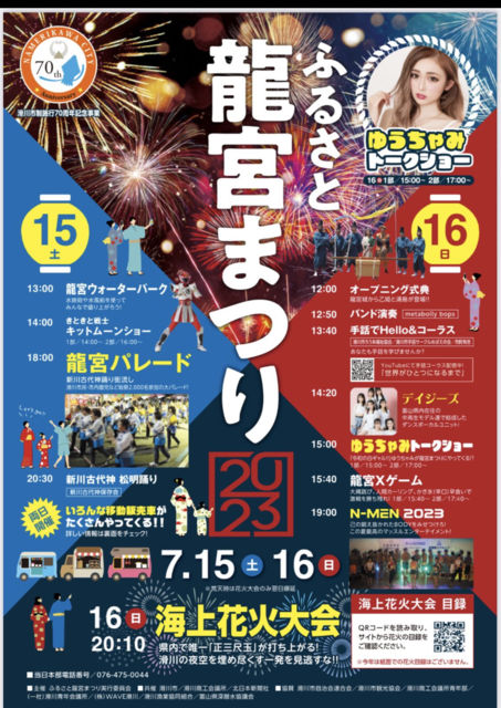 まずは、お祭り・花火大会、ご一緒いかがでしょうか!? 現地集合や、お迎えはお任せします ふるさと龍宮まつり海上花火大会 富山県滑川市 / 富山湾(ほたるいかミュージアム周辺) 開催期間 2023年7月16日(日)祭りは7月15日(土)・16日(日) 開催時間 20:10〜20:50祭りは11:00〜21:00 男性、独身です インフラ企業勤務してます 独身女性の方との お祭り、花火大会が希望です! 浴衣とか無理せず 普段着で大丈夫です! 僕も普段着で行きます!