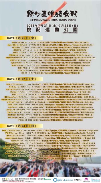 「SEKIGAHARA IDOL WARS 2023 - 関ケ原唄姫合戦- 』 @ 桃配運動公園」http://idolwars.net/ 日程:07/21(金).22(土).23(日) 開場 / 開演 会場:桃配運動公園 料金:7,000円〜45,000円 チケット:https://l-tike.com/concert/mevent/?mid=355835
