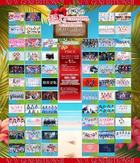 ¡ÖNew Generations!! - ¿¿²Æ¤ÎĶ¡¦Premium Circuit - Day1¡× ÆüÄø¡§08/12(ÅÚ) ³«¾ì / ³«±é ²ñ¾ì¡§Lives NAGOYA / Lives FARM / Ìî³°ÆÃÀߥ¹¥Æ¡¼¥¸ ÎÁ¶â¡§1Day VIP 10,600±ß / °ìÈÌ600±ß (D¹þ) ¥Á¥±¥Ã¥È¡§https://t.livepocket.jp/e/new_generations_premium_summer