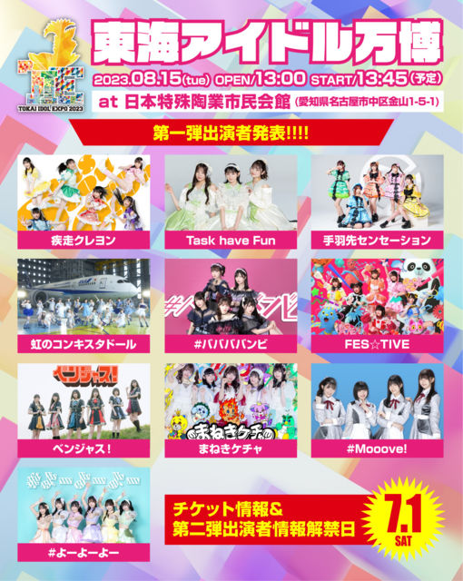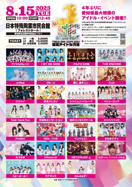 ¡ÖÅ쳤¥¢¥¤¥É¥ëËüÇî2023¡× ÆüÄø¡§08/15(²Ð) ³«¾ì13:00 / ³«±é13:45 ²ñ¾ì¡§ÆüËÜÆÃ¼ìÆ«¶È»Ô̱²ñ´Û¡¡°¦Ãθ©Ì¾¸Å²°»ÔÃæ¶è¶â»³£±ÃúÌÜ£µ¡Ý£± ÎÁ¶â¡§1FÁ°Êý 10,000±ß / 1F°ìÈÌ 5,000±ß / £²F½÷À¸ÂÄê 2,500±ß ¥Á¥±¥Ã¥È¡§https://t.livepocket.jp/e/nagoya_expo2023 ¢¨7/11(²Ð) 21:00 〜 ¢¨Á°Êý¥¨¥ê¥¢¡Ê¥¥ã¥ó¥»¥ëÂÔ¤ÁÈÎÇä¡Ë7/13 21:00〜