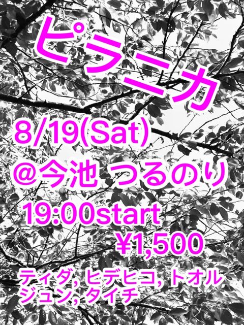 8·î19Æü(ÅÚ) °¦Ãθ© ̾¸Å²° º£ÃÓ ¤Ä¤ë¤Î¤ê https://www.facebook.com/MusicCafeBarTsurunori ½Ð±é: ¥Ô¥é¥Ë¥«(¥Æ¥£¥À¡¢¥Ò¥Ç¥Ò¥³¡¢¥È¥ª¥ë¡¢¥¸¥å¥ó¡¢¥¿¥¤¥Á) start19:00 ¥Á¥ã¡¼¥¸1500±ß +1DRINK