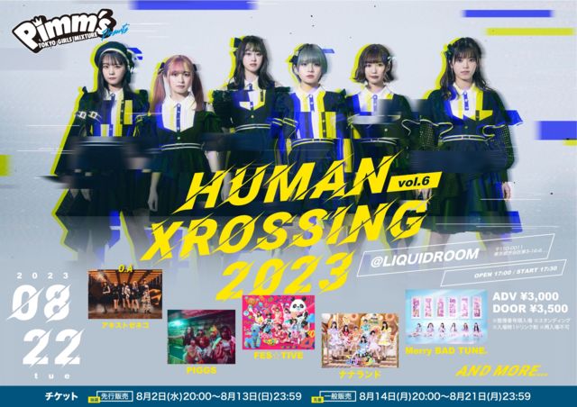「Pimm's Presents『Human Xrossing 2023 Vol.6』」 日程:08/22(火) 開場17:00 / 開演17:30 会場:恵比寿LIQUIDROOM 料金:前売3,000円 / 当日3,500円 (D別) チケット:https://ticket.rakuten.co.jp/music/jpop/idle/RTY3HX6/ 先行(抽選)8月3日(木)20:00〜8月13日(日)23:59 一般(先着)8月14日(月)20:00〜8月21日(月)23:59