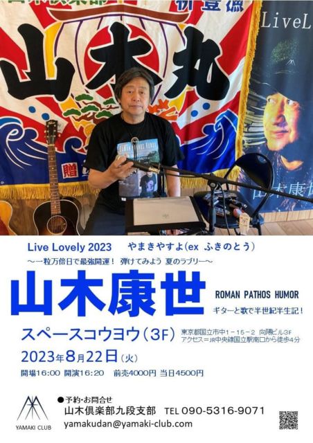 「山木康世 Live Lovely 2023」 〜一粒万倍日で最強開運! 弾けてみよう 夏のラブリー〜 会場=スペースコウヨウ(3F) 東京都国立市中1−15−2 向陽ビル3F アクセス=JR中央線国立駅南口から徒歩4分 https://spacekoyo.xsrv.jp/map.html 開場16:00 開演16:20 前売4000円 当日4500円 予約・問合せ 山木倶楽部九段支部 yamakudan@yamaki-club.com 090−5316−9071