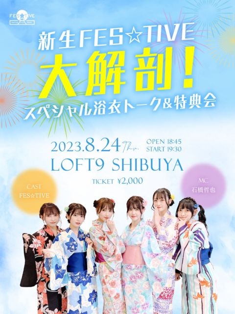 「新生FES☆TIVE大解剖!スペシャル浴衣トーク&特典会」 日程:08/24(木) 開場18:45 / 開演19:30 会場:LOFT9 SHIBUYA 料金:2,000円 MC:石橋哲也 チケット:https://tiget.net/events/264782 ※8/13(日)21:00〜