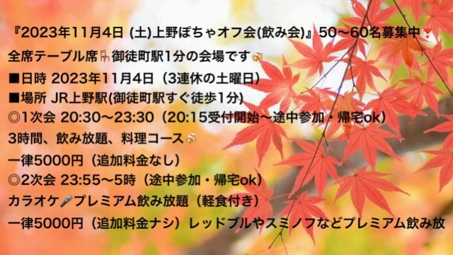 50名前後で締切しますので早めのご連絡お願いします(当日お店の席が空いてれば人数拡大します) 2023年11月4日(3連休の土)上野ぽちゃオフ会を開催致します 皆さま〜ここ最近いきなり寒くなりましたが体調など壊してませんか?ホントもう冬ですよね そして来月の11月も月1恒例の上野ぽちゃオフ会開催致しますよー\(^o^)/ そして後書きですが2023年10月7日のハロウィン飲み会では1次会67名、二次会35名で総勢102名の方が来てくださいました♪ いつも多くの参加者様〜ありがとうございます(^^) 次回もT