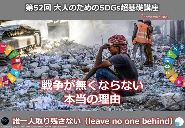 戦争が無くならない本当の理由/第52回大人のためのSDGs超基礎講座(2023年11月7日) チケット https://kanglo-sdgs231107.peatix.com/view https://www.facebook.com/events/1263796121681831 --------------------------- 2015年9月25日、国連総会にてSDGsが採択され、あれからすでに8年が経ちました。人類は、21世紀に積み残してしまった地球全体の危機的課題の解決に向けてどれ程前進できたのでしょうか?SDGsは、人類史上初の世界規模における共通目標として始まりました。期限は2030年です。この時までに、人類がこの目標の達成に向けて