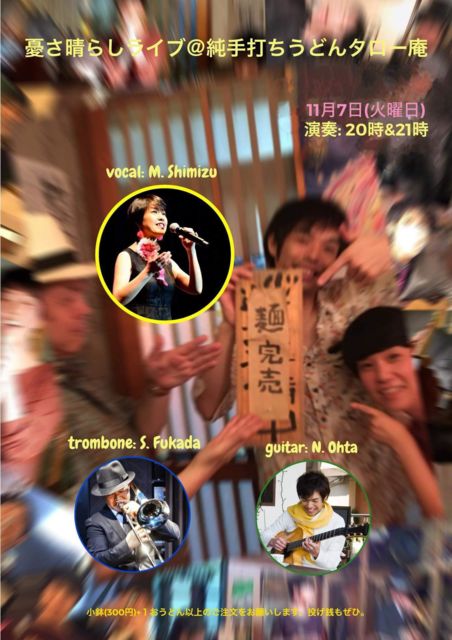 日時:11月7日(火)1st 20:00- / 2nd 21:00- 場所:純手打ちうどん町田タロー庵 https://taro-an.jimdofree.com/ MC:投げ銭(+TC:300円(小鉢付)+1品以上のご注文(おうどんもぜひ!)) メンバー:tb/深田悟 gt/太田希 vo/清水方代 明日11/7(火)は2ヶ月に1度の美味し楽しい音作り 20時から純手打ちうどん町田タロー庵で演奏します 完全生音のアンプラグドライブ絶品のお惣菜やおでんをつまみながら、遊び心たっぷりの音を楽しんでいただけたら幸せです タローさん渾身のおうどんも必ずやご賞味ください