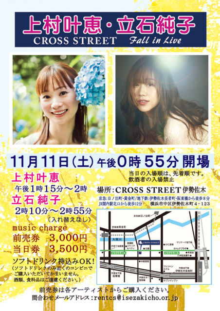 2023/11/11 (土)伊勢佐木町クロスストリート open: 12:55 出演時間: 13:15〜14:00 出演: 上村叶恵 / 立石純子 / 入場料: 前売り3,000円、当日3,500円(ドリンク持ち込みOK) ※当日の入場順は先着順です。 ご予約はこちらから⇨ http://uemura-kanae.com/liveinfo/ アクセス:http://www.isezakicho.or.jp/~ueda/cs/access.html http://www.isezakicho.or.jp/~ueda/CSmap.html