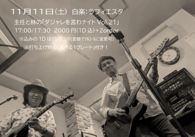 ●概要 11月11日(土) 白楽:ラフィエスタ http://www.lafiesta-jazz.jp/ 主任と林の「ダジャレを言わナイトVol.21」 17:00/17:30 2000円(1D込)+2order ※込みの1Dはソフトドリンク(差額でアルコールに変更可) ※打ち上げ時の「選べる1プレート」付き! ●タイムスケジュール 17:30-18:10 岡本主任(RC関連ソング) 18:20-19:10 林あきひこ 19:15-19:55 岡本主任 19:55-20:00 アンコールセッション 20:00〜 打ち上げ♪ ●「打ち上げ」に関して このイベントでは、終演後にその場で打ち上げを行っております。 そ
