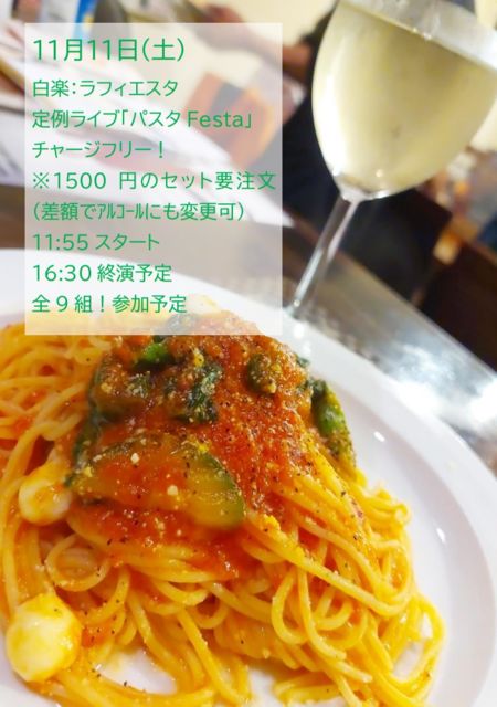 ●概要 11月11日(土) 白楽:ラフィエスタ http://www.lafiesta-jazz.jp/ 定例ライブ「パスタFesta」への参加 チャージフリー! ※1500円のセット要注文(差額でアルコールにも変更可) 11:55スタート 16:30終演予定 全9組!参加予定 ●内容 土曜の午後。美味しいパスタを食べながら音楽を楽しもう♪ という、林あきひこさん主催の定例ライブです。