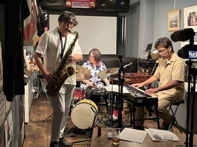 寺島優樹(org)さん、藤田絢三(sax)さん、丸谷茜(ds)さんのトリオです。 寺島さんは、これまで何度もピアニストとしてご出演いただきましたが、オルガンを演奏します。 尚美音大を卒業後、2006年にNYへ短期留学。2008浅草ジャズコンテストソロ部門でグランプリ受賞。2015年再びNYへ行き、ハモンドオルガンに感銘を受けたとのこと。 藤田さんは、明治大学ジャズ研究会でバンド・マスターを務め、早稲田大学モダン・ジャズ研究会にも所属。1990年より、バークリー音楽院パフォーマンス・サックス科に留学し、帰国後は、自らのユニットでのラ
