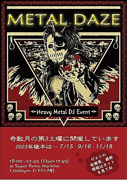 2023.11.18(土) 18:00〜22:45 (17:45 Open) 1000円(1ドリンク付) ※イベント終了後は通常バー営業 @Super Retro Machine (北堀江のRestaurant Bar) 電話: 06-6643-9286 住所: 大阪市西区北堀江1-10-2 ・地下鉄四つ橋線の四ツ橋駅4番・6番出口から2分 ・地下鉄長堀鶴見緑地線の西大橋駅4番出口から2分 ・地下鉄御堂筋線の心斎橋駅7番出口から8分 【ゲスト】メッタリマンシールでおなじみのキトライライヘイさん再び!☆ 【プレゼント】メタTを何枚か配布します。お客さんの多い後半の時間ぐらいに配ろうかなと思っ