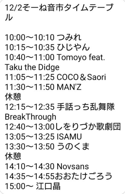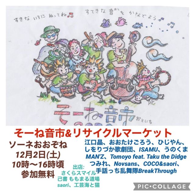 毎月第1土曜日に好評開催のステージ、各種詰め放題始め格安(激安)品大放出のリサイクル品展示販売、クリエイター達の出店と様々なコンテンツからなる地域密着型月例入場無料イベント。 会場の都合で2回続けて中止となり9月以来久々の開催。 39回目の開催。 □12/2(土) 題目: そーね音市&リサイクルマーケット 場所: 山田「ソーネおおぞね」 http://www.sone-ozone.com (ソーネホール) 住所: 愛知県名古屋市北区山田二丁目11-62 大曽根住宅1棟1階 電話: 052-910-1001 交通: ◎地下鉄名城線/名鉄瀬戸線「大曽根」より900m ◎地下鉄名城線・上飯田線