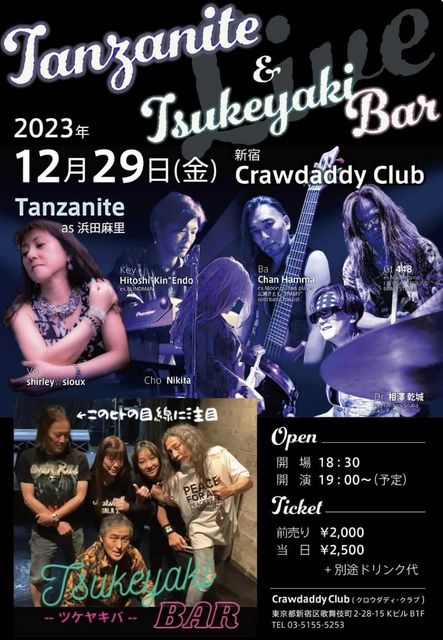 12/29 本日のライブ Tanzanite & Tsukeyaki BAR Live OPEN 18:30 START 19:00 CHARGE 予約\2000 / 当日\2500 よろしくお願いいたします!!