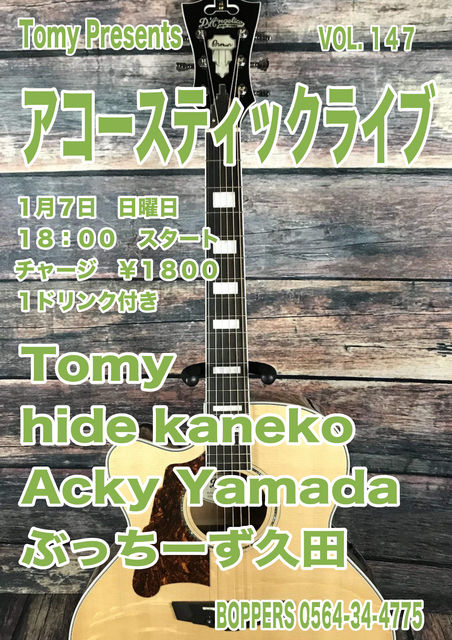 Tomy Presents アコースティックライブ VOL.147 1月7日 日曜日 18:00 スタート チャージ ¥1800 1ドリンク付き Tomy hide kaneko Acky Yamada ぶっちーず久田