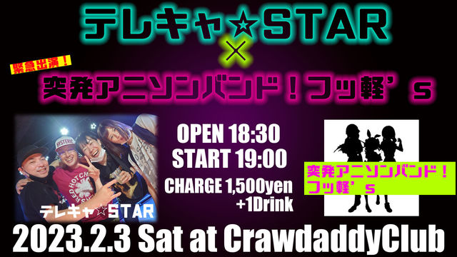 2/3 本日のライブ テレキャ☆STAR & 突発アニソンバンド!フッ軽's LIVE OPEN 18:30 START 19:00 CHARGE 1500円 よろしくお願いいたします!!