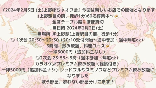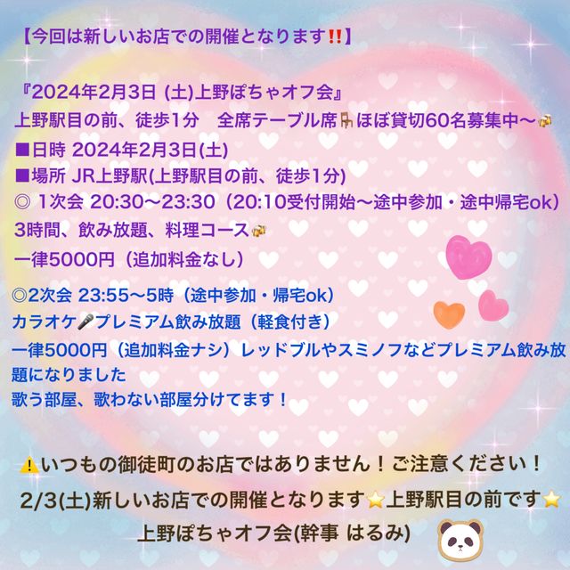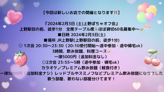 【次回2/3(土)は新しいお店で開催しますexclamation ×2危険・警告いつもの御徒町ではありません! 上野駅目の前のお店です(上野駅から徒歩1分) 60名で締切しますので早めのご連絡お願いします(全席テーブル席&ほぼ貸切です) 皆さま〜2024年もスタートしましたがいかがお過ごしですか? 前回1/6(土)新年会の後書きですが1次会94名、二次会40名で総勢134名の大勢の皆様が来てくださいました♪ ホントにいつも多くの参加者様〜ありがとうございます(^^) そして当日席がいっぱいになりお断りしてしまった方々ホントにすみませんでした。 うちの