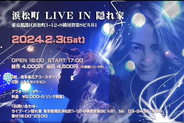 英三さんと素敵な夜を楽しみましょう。 ◉前売り \4,000-(ドリンク別途) ◉当日  \4,500-(ドリンク別途) ◉アフターパーティー \2,000-(ドリンク別途) 16時00分 開場 17時00分 開演 17時00〜18時15分 I部 英三さんアコースティック 18時30分から19時40分 2部 メタルセッション 20時00分〜21時00分 アフターパーティー エントリー&申し込みはFacebookイベントページからよろしくお願いいたします。 [イベントページ] https://www.facebook.com/share/q324TwVqdVgPaVLs/?mibextid=9l3rBW