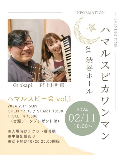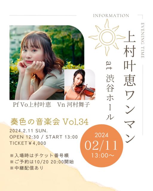 2024/02/11 (日)渋谷ホール 昼公演 「上村叶恵ワンマンライブ〜奏色の音楽会 vol.34〜」 open 12:30 start 13:00 出演: 上村叶恵 / Vn 河村舞子 入場料: ¥4,000(ドリンク持ち込み可) 夜公演 「ハマルスピカワンマンライブ〜ハマルスピー会 vol.1〜」 open 17:30 / start 18:00 出演: ハマルスピカ(Gt okapi, Pf 上村叶恵) 入場料: ¥4,500(音源データプレゼント付(ドリンク持ち込み可) 渋谷ホール:https://www.shibuyahall.com/ 東京都渋谷区桜丘町15-17 NK