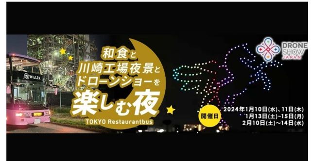 東京駅丸ビル前1645から スカイバスで出発しレインボーブリッジ、東京タワーと廻り川崎の工場夜景を見ながら 車内で和食ディナーとなります ラストは川崎競馬場で400機のドローンを 眼の前で贅沢に見て チッタデッラにて解散となります 値段が少々張りますが 素敵なプランだと思います 料理は銀座の名店 おのでらでございます✨ 1名、15800円 先に入金して予約済ませますが 集まらなければ機会倒れとなる可能性もあることを ご了承くださいネ