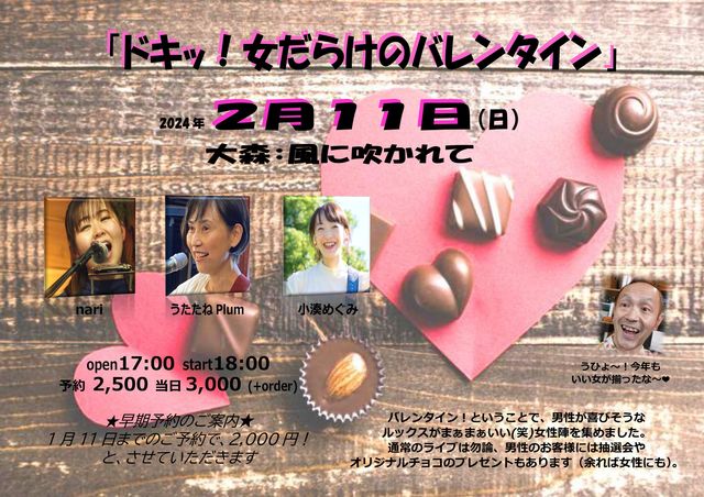 ●概要 2月11日(日) 大森:風に吹かれて http://oomorikazefuka.weebly.com/ 第15回「ドキッ!女だらけのバレンタイン」 17:00/18:00 予約 2500 当日3000 (+オーダー) ※1/11までの予約で、2000! 出演:岡本主任、nari、うたたねPlum、小湊めぐみ ●タイムスケジュール 18:00 岡本主任 18:30 nari 19:10 抽選会+休憩 19:30 うたたねPlum 20:10 小湊めぐみ 20:50 フィナーレ 21:00 終演 ●特色 バレンタイン!ということで、男性が喜びそうなルックスがまぁまぁいい(笑)女性陣を集めました。 通常のライブは勿