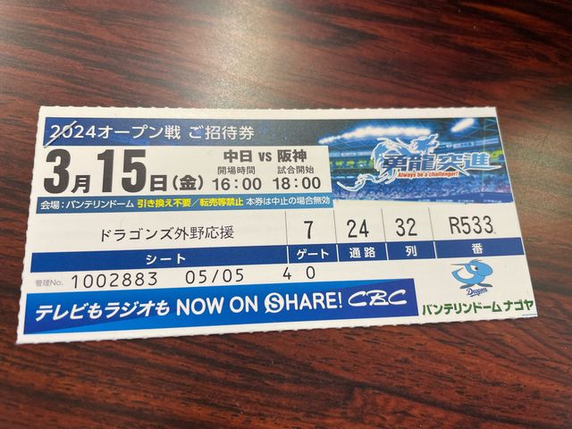 2024オープン戦のご招待券頂きました。3名様無料招待出来ます。 17時30分迄に7ゲートに来れる人でお願いします。