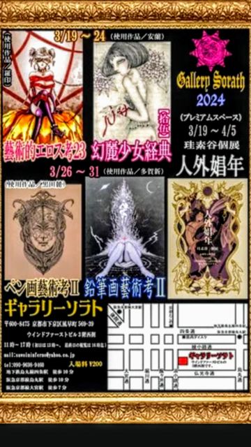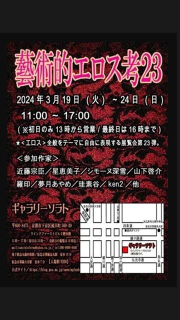 @ギャラリーソラト 京都 綾小路+油小路 2024 03/19(火曜日)〜24(日曜日) 11:00〜17:00 芸術的エロス考 23 近藤宗男臣/星恵美子/シモーヌ深雪/山下啓介/羅印/夢月あや/珪素谷/Ken2 ほか 初日のみ13時から 最終日は14時まで