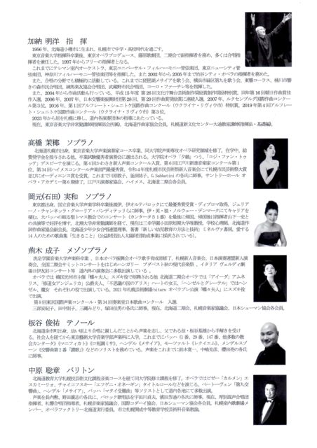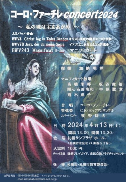 J.S.バッハ作曲 BWV4 Christ lag in Todes Bandenキリストは死の縄目につながれ BWV78 Jesu, der du meine Seele イエスよ、あなたはわが魂を BWV243 Magnificat D-Dur マニフィカート 指 揮 加納 明洋 独 唱 高橋茉椰 岡元(石田)実和 荊木成子 板谷俊祐 中原聡章 合 唱 コーロ・ファーチレ 管弦楽 C.F.バロックアンサンブル コンサートマスター 牧野 時夫 日 時 2024年4月13日(土)開場13:00 開演13:30 会 場 札幌サンプラザ ホール(札幌市北区北24条西5丁目) 入場料 1000円