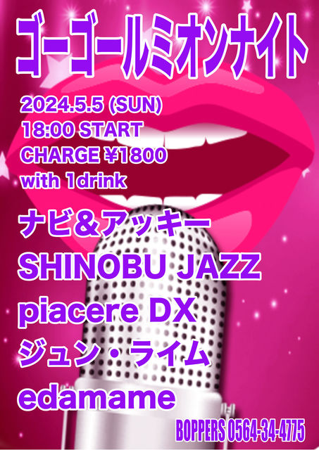 ¥´¡¼¥´¡¼¥ë¥ß¥ª¥ó¥Ê¥¤¥È 2024.5.5 (SUN) 18:00 START CHARGE \1800 with 1drink ¥Ê¥Ó¡õ¥¢¥Ã¥¡¼ SHINOBU JAZZ piacere DX ¥¸¥å¥ó¡¦¥é¥¤¥à edamame