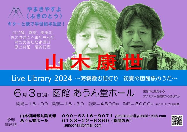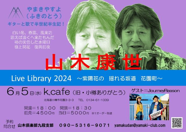 2024年6月5日(水) 「山木康世 Live Library 2024」 〜紫陽花の 揺れる坂道 花園町〜 ゲスト=JourneyReason 会場=k.cafe(旧・小樽ありがとう) 北海道小樽市花園3-3-3 TEL 0134-61-1339 開場=18:00 開演=18:30 前売=4500円 当日=5000円 ※1オーダー別途 予約・問合せ 090−5316−9071 (山木倶楽部九段支部) yamakudan@yamaki-club.com