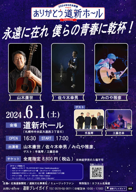 2024年6月1日(土) 「ありがとう 道新ホール」 〜永遠に在れ 僕らの青春に乾杯!〜 会場=道新ホール ●札幌市中央区大通西3丁目6 道新ビル大通館8階 出演 山木康世/佐々木幸男/みのや雅彦 ゲスト 手風琴/工藤忠幸 開場=16:30 開演=17:00 料金=全席指定 8,800円(税込) ※未就学児の入場不可。 プレイガイド 道新プレイガイド https://doshin-playguide.jp セイコーマート店内マルチコピー機(セコマコードA24060101 ) 市民交流プラザチケットセンター 北1西1 札幌市民交流プラザ2階 チケ