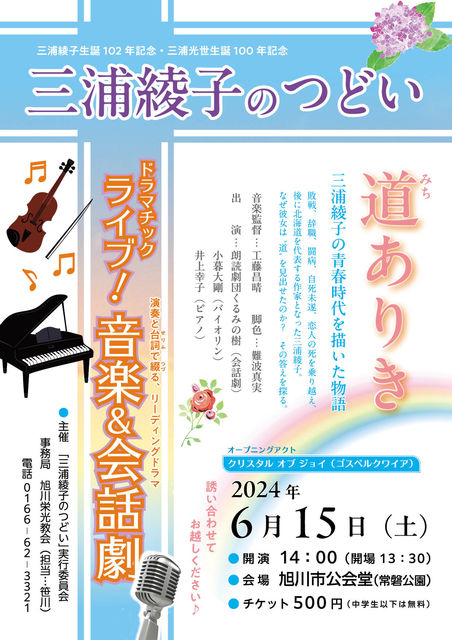 ➀開催地 北海道旭川市 「三浦綾子のつどい」 道ありき 三浦綾子の青春時代を描いた物語 敗戦、辞職、闘病、自死未遂、恋人の死を乗り越え、 後に北海道を代表する作家となった三浦綾子。 なぜ彼女は”道”を見出せたのか?その答えを探る。 音楽監督:工藤昌晴 脚色:難波真実 出 演:朗読劇団くるみの樹(会話劇) 小暮大剛(バイオリン) 井上幸子(ピアノ) 日 時:2024年6月15日(土)14:00〜(開場13:30) 会 場:旭川市公会堂(常盤公園) チケット:500円(中