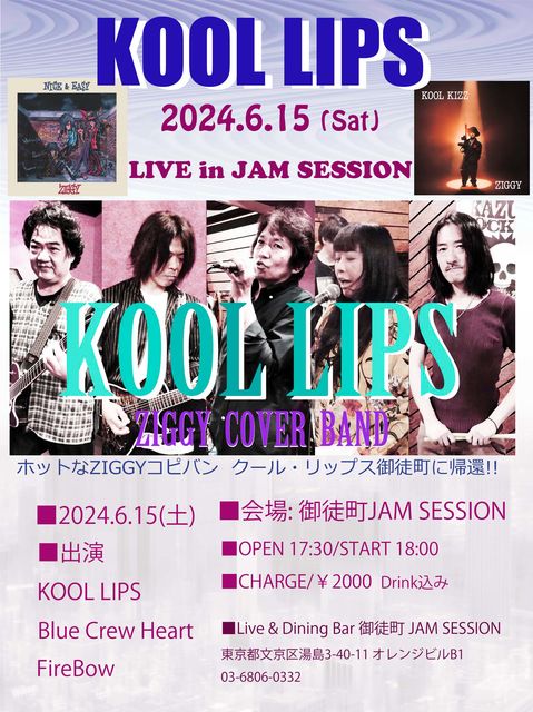 ZIGGY¥³¥Ô¥Ð¥ó¡¢KOOL LIPS ¤¤¤è¤¤¤è¥é¥¤¥Ö¶á¤Å¤¯! ¢£6/15(ÅÚ) ¸æÅÌÄ®JAM SESSION https://www.jamsession.jp/access/ ¢£OPEN 17:30 START 18:00¡¡ ¢£½Ð±é:KOOL LIPS¡¢Blue Crew Heart¡¢FireBow ¢£ÅöÆü:¥É¥ê¥ó¥¯¹þ2000±ß 18:00¡Á18:40¡¡¡FireBow¡¡±éÁÕ 18:50¡Á19:30¡¡¢Blue Crew Heart¡¡±éÁÕ 19:40¡Á20:20¡¡£KOOL LIPS¡¡±éÁÕ º£²ó¤Ï¥ï¥ó¥Ê¥¤¡¢¥·¥ó¥Þ¥¤¡¢¥¦¥¤¥¹¥¡¼¡¢¥É¥ó¥¹¥È¡¢¥°¥í¥ê¥¢¤Ê¤É¥ª¡¼¥ë¥É¥Ê¥ó¥Ð¡¼¤Ç¸Ç¤á¤¿¥»¥Ã¥È¥ê¥¹¥È¡£¤¼¤Ò¤ª±Û¤·¤¯¤À¤µ¤¤¤Í¢ö